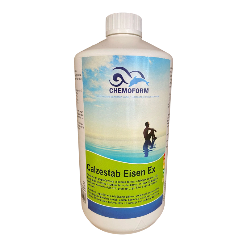 Primjena: Količinu sredstava usklađujemo s obzirom na tvrdoću vode odnosno s obzirom na količinu prisutnih metalnih iona. Calzestab eisenex možemo dodati neposredno u bazen već prije prvog kloriranja. Nasljedna doziranja tako ovise o količini dodane svježe vode odnosno najmanje jednom mjesečno. Od dodavanja Calzestab eisenex u vodu mora proći barem 24 sata prije dodavanja klora ili algicida!Pri tvrdoći vode 10 dH potrebno je prvi put dozirati 500 ml sredstva na 10 m3 vode, nakon doziranja 150 ml na 10 m3 vode. Pri tvrdoći vode 10-20 dH potrebno je prvi put dozirati 1000 ml sredstva na 10 m3 vode, nakon doziranja 200 ml na 10 m3 vode. Pri tvrdoći vode 20-30 dH potrebno je prvi put dozirati 1500 ml sredstva na 10 m3 vode, nakon doziranja 250 ml na 10 m3 vode. Pri tvrdoći vode iznad 30 dH potrebno je prvi put dozirati 2000 ml sredstva na 10 m3 vode, nasljedna doziranja 300 ml na 10 m3 vode.